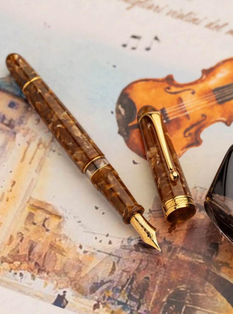 Корпус ручки, изготовленный из смолы под дерево, напоминает по цвету старинные скрипки, а позолоченные детали придают ей роскошный и изысканный вид. Стержень из 18-каратного золота обеспечивает плавное и точное письмо, что делает эту ручку незаменимой для коллекционеров и любителей письма.