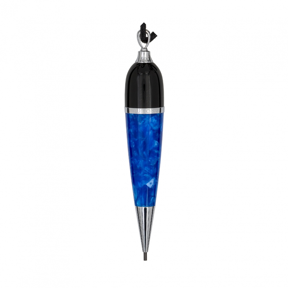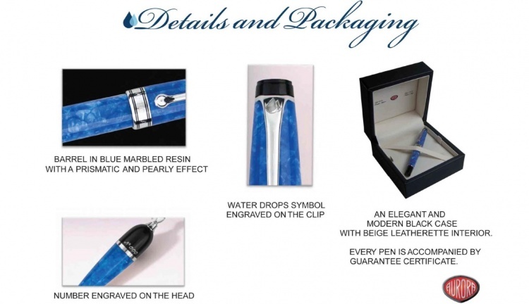 Корпус и колпачок ручек Aurora Aqua Mini изготовлены из синей смолы под мрамор и дополнены платинированными элементами отделки. Символ воды в виде капли размещен на основании клипа.