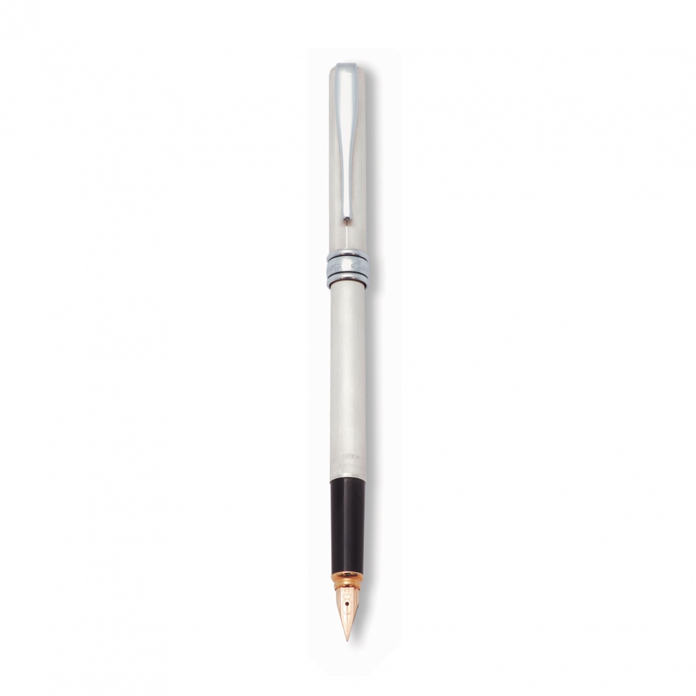 Перьевая ручка с пером из цельного золота 585 пробы, покрытым родием. Колпачок и корпус из цельного серебра 925 пробы, линейное гильоширование, хромированная отделка.